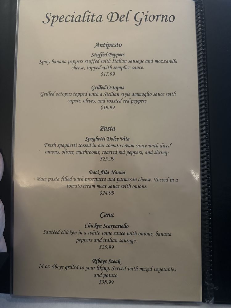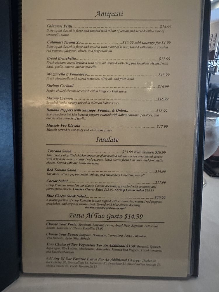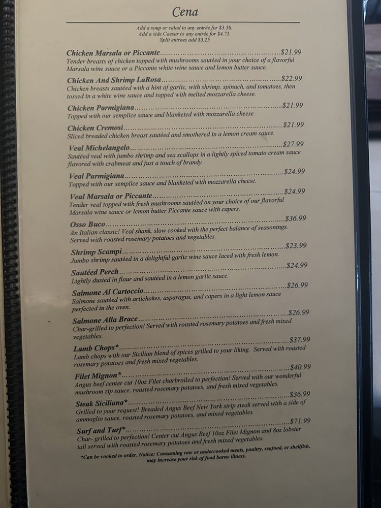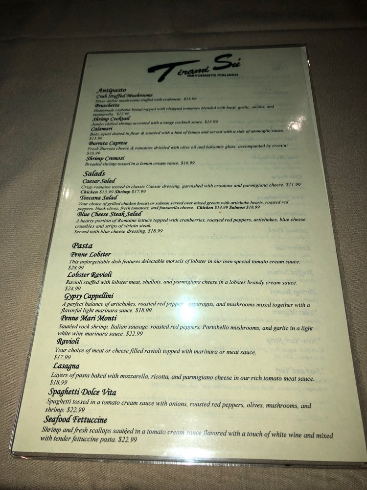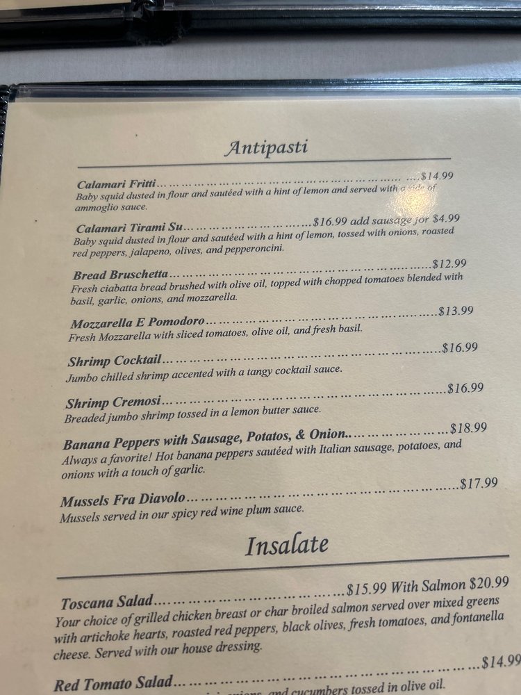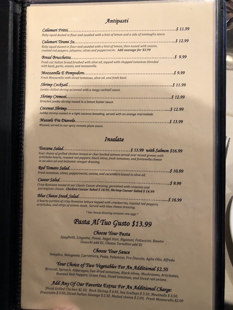 Introducing the menu at Tirami Su Italian Restaurant of Northville, located at 146 Maincentre Northville, MI 48167. This cozy restaurant offers a variety of traditional Italian dishes with a twist. From Chicken Marsala to Chicken and Shrimp LaRosa, each dish is prepared with care and bursting with flavor. Start your meal with the crispy Calamari Fritti or the flavorful Calamari Tirami Su. For a refreshing option, try the Toscana Salad or the Red Tomato Salad. Customers praise the attentive service and friendly atmosphere. The desserts, especially the tiramisu, are highly recommended. The extensive menu, reasonable prices, and welcoming staff make Tirami Su a must-visit for Italian food enthusiasts.