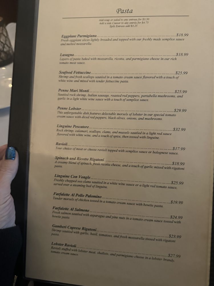 Rock shrimp, calamari, scallops, clams, and mussels sauteed in a light red sauce flavored with white wine, and a touch of spice, then tossed with linguine.